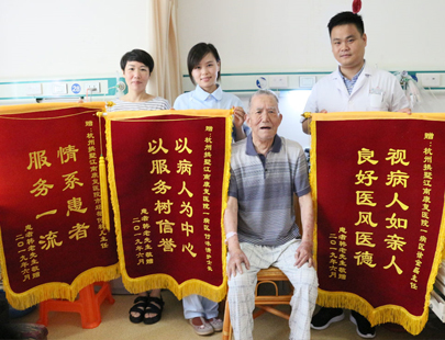 在送上锦旗时,家属鞠躬感激道:江南康复医院院领导、医务人员、客服部何秋儿主任,工作认真负责,视病人如亲人,积极开导病人、解答病情、努力消除患者精神上的负担,缓解了患者心理上的压力,给患者以精神上的安慰给予了极大的肯定。