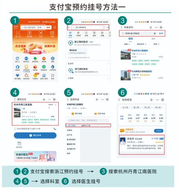 打开支付宝,搜索“浙江预约挂号平台”,快速完成预约。具体流程请见下图。