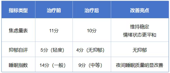 2、心理睡眠评估:广泛性焦虑量表11分(中度焦虑),抑郁自评5分(轻度抑郁),匹兹堡睡眠指数14分(质量一般);