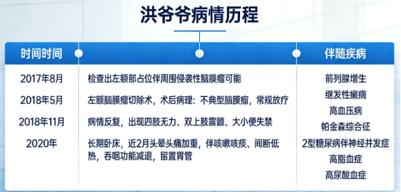 洪爷爷,一位72岁的老人,因“反复头晕伴肢体乏力7年余,再发加重伴头痛2月余”于2020年入院。回首他的求医路,充满了艰辛与不易。 2017年8月,洪爷爷被检查出左额部占位伴周围侵袭性脑膜瘤可能。2018年5月,他接受了左额脑膜瘤切除术,术后病理诊断为不典型脑膜瘤,并进行了常规放疗。然而,半年后病情出现反复,逐渐出现四肢无力、双上肢震颤、大小便失禁等症状。 长期与疾病抗争的过程中,洪爷爷的身体每况愈下,逐渐进入长期卧床状态。近2个月来,他反复出现头晕、头痛,程度较前加重,还伴有咳嗽、咳痰、间断低热,吞咽功能也明显减退,出现进食呛咳,不得不留置胃管维持营养供给。 更令人揪心的是,洪爷爷还同时患有前列腺增生、继发性癫痫、高血压病、帕金森综合征、2型糖尿病伴神经并发症、高脂血症、高尿酸血症等多种疾病,长期依靠药物控制。
